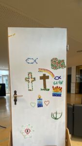 Falls ihr mehr wissen wollt, geht unten in die Aula! Schaut euch die Tür an und öffnet die Codes, um Weiteres zu erfahren. Ich finde das eine tolle Idee der Religionslehrer unserer Schule!
