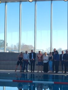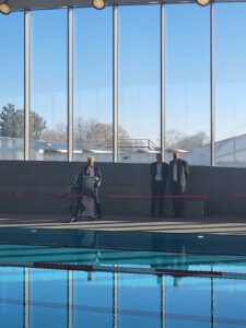 Oben angekommen sahen wir zum ersten Mal den eigentlichen Baderaum. Durch die hohen Decken und die wunderbare Sonneneinstrahlung von allen Seiten wirkt das Hallenbad sehr modern, einladend und entspannend. Alle Gäste versammelten sich um das große Hauptbecken und lauschten daraufhin einer Rede vom ersten Bürgermeister Lorenz Müller, dem Landrat Martin Sailer und dem Dipl.-Ing. Architekt Wolfgang Gollwitzer, wobei die Planung, Gestaltung und zukünftige Verwendung hauptsächlich thematisiert wurden. In erster Linie soll das Bad als Schulbad genutzt werden, damit die Schülerinnen und Schüler der umliegenden Schulen in sicherer Umgebung das Schwimmen erlernen können. Der verstellbare Hubboden im zweiten, kleineren Becken weiter vorne im Bad trägt ebenfalls maßgeblich dazu bei. Allerdings sollen auch Privatleute das Bad außerhalb der Schul- und Sportaktivitäten nutzen können. Daher wurde noch ein Becken für Kinder mit spielerischen Aktivitäten und ein Sprungturm mit einem ein- und dreimeter- Brett mit integriert.